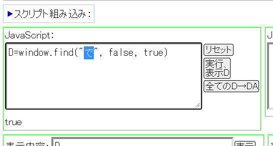 D=window.find("で", false, true) //検索文字列「で」、大小区別しない、後方検索。