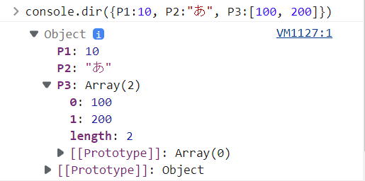 指定オブジェクトをコンソールに表示します。表示物を展開すると、詳細が表示されます。