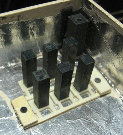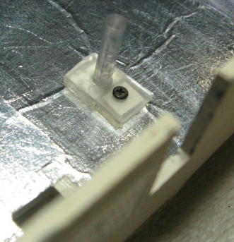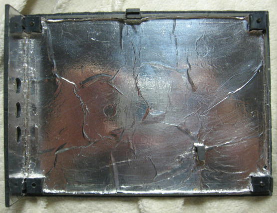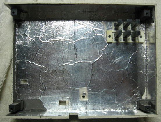 ケースの内側にはアルミホイルを貼り付けています。貼り付けには 3M 社のスプレーのり「55」を使用しました。接着力としてはちょっと弱いので、少し剥がれて浮き上がっている箇所がみられる。