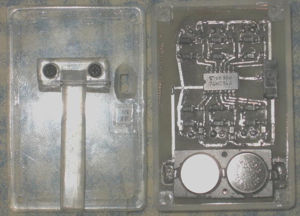 電池ボックスは、廃物利用…ビデオデッキのサイドの厚いプラスチック。普通なら、スチロール プラスチックの6mm厚はないので、3mm厚のを貼り合わせて作ります。
