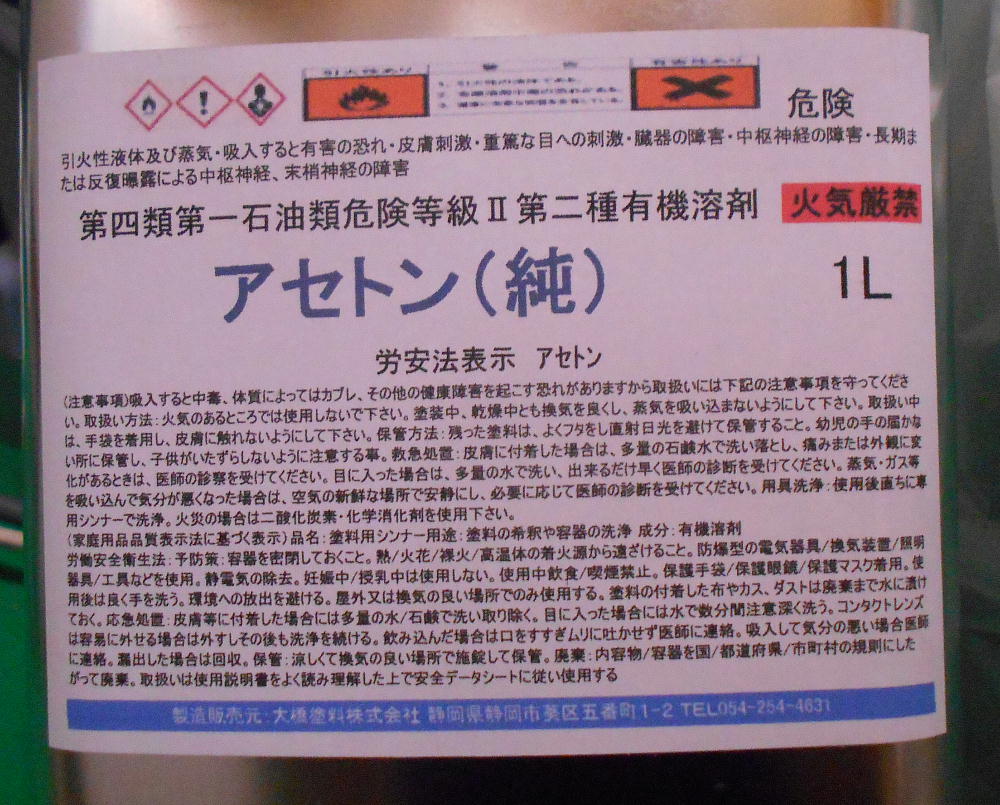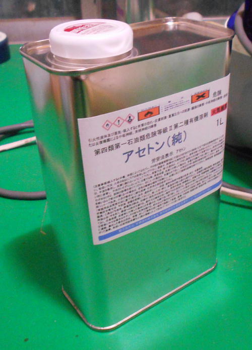 ウレタン?塗料など、アセトンは可溶ですが、成分が分離することがあるので要注意です。…何の塗料だったか記憶に乏しいです。