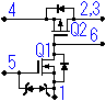 | NMOS-FET。100V、0.7A。G1‐Sに保護D、G2‐Sに保護D、G1‐G2に100kΩ、D←SにD有。PDF/200509