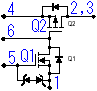 | MOS-FET。Q1(Nch。20V、540mA。D←SにD有)。Q2(Pch。20V、-430mA。D→SにD有)。Q1=Q2(G‐Sに保護D有)。PDF/200603