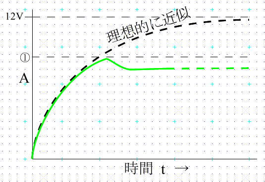 途中で下がっていますよね、こういうことが起こる部品があります。このまま使用すると、電圧安定回路に負担が掛かることになります。後には、場合によっては回路が発熱、破損となるでしょうね。交換が必須です。
